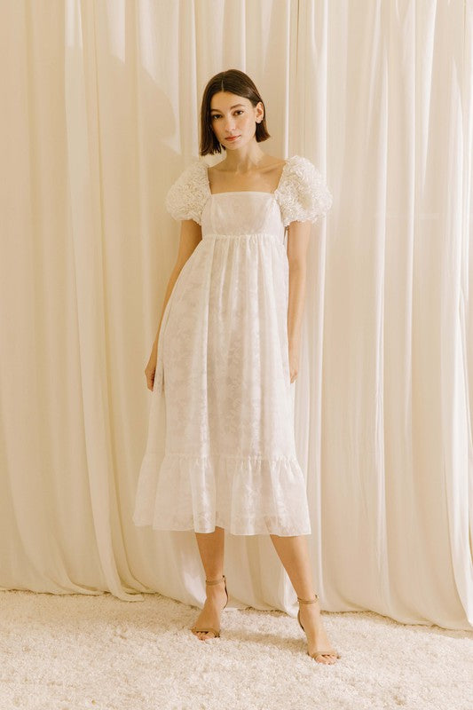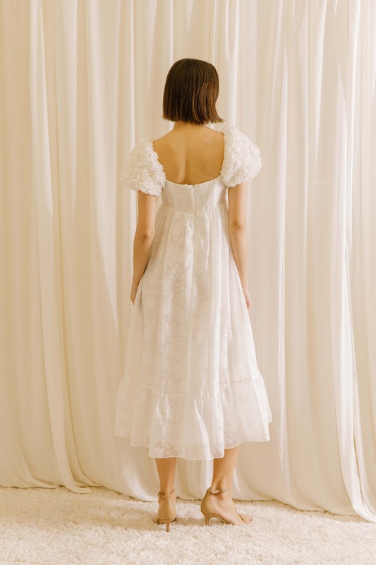 Achieve an elegant and timeless look with the White Rosette Midi dress. This romantic design features a square neckline, puffy sleeves, and darts for a perfect fit. An empire waist and smocked upper back ensure a flattering silhouette and an invisible zipper. The dress exudes feminine charm, allowing you to feel confident and radiant on any occasion.