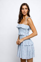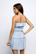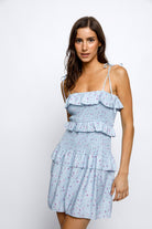 Step into spring with the Aurelia Blue Layered Mini Dress. Its small floral print and ruffled layers give a charming look. The straight neckline and self-tie spaghetti straps add a touch of sweetness, while the smocked torso offers a flattering fit.