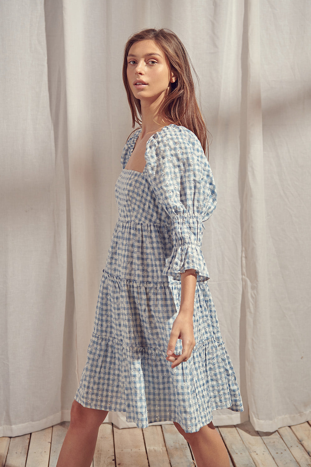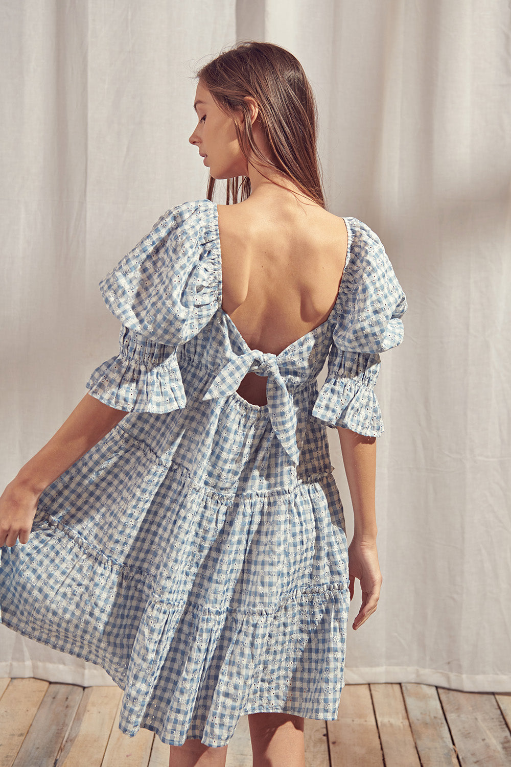 This must-have baby doll mini dress is the perfect combination of beauty and sweetness, embroidered with a gingham floral pattern. It features a square neckline, puffy 3/4 length sleeves with ruffled cuffs, and an open back with a self-tie bow. This gingham dress is sure to be the perfect addition to any picnic, spring and summer or everyday outfit.