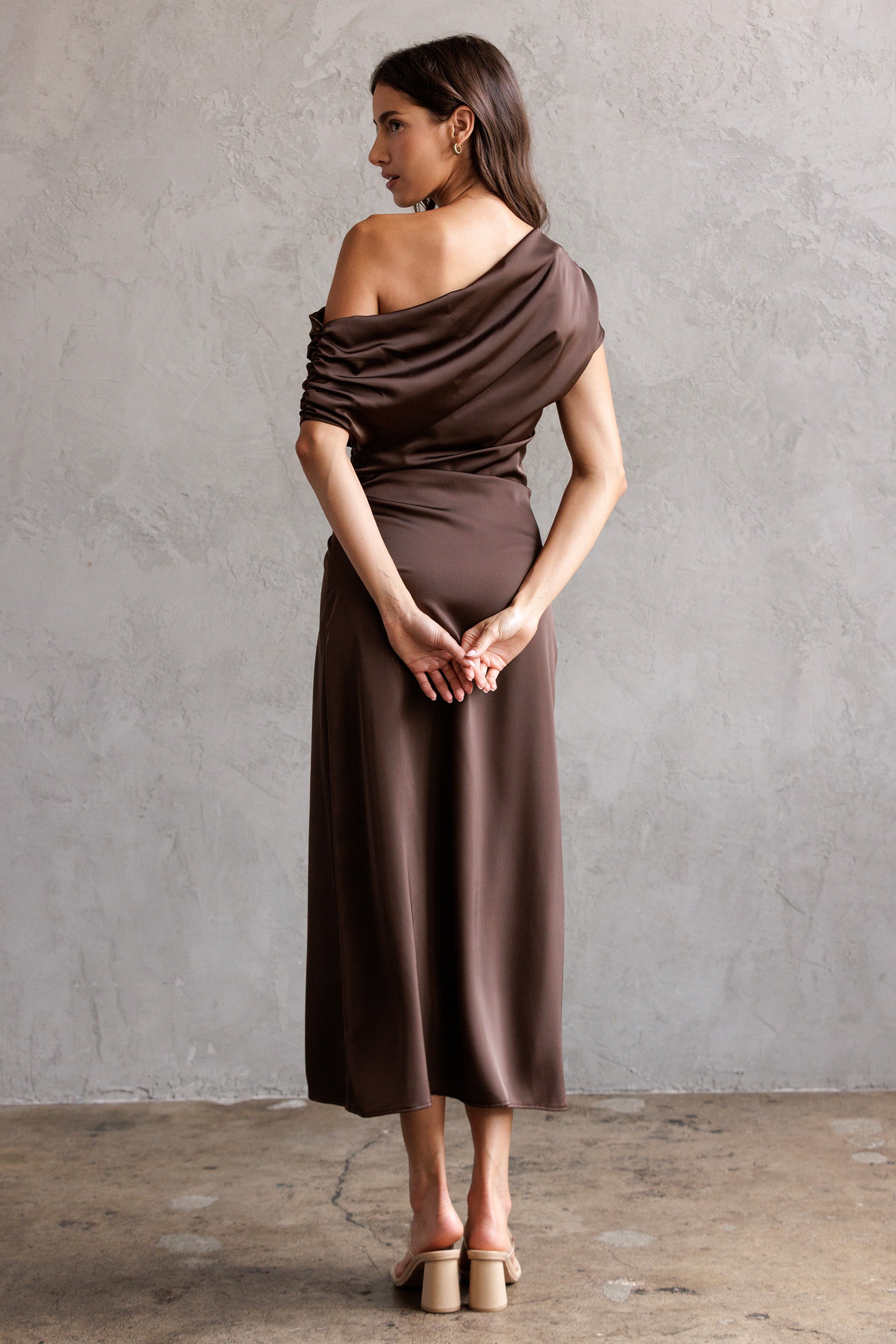 Meet the gown that makes effortless elegance feel easy. The Lyrah One-Shoulder Dress drapes beautifully with a soft, slouchy neckline and a modern asymmetric sleeve.