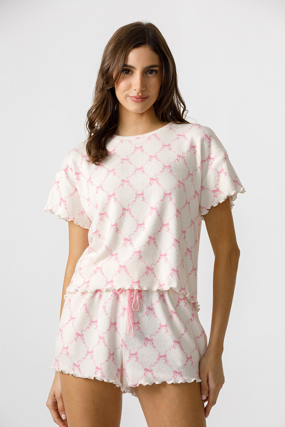 Stay comfy and cute in the Sweet Bow Knit Lounge Set. This cozy two-piece features a soft cream knit base with an allover pink bow pattern for a feminine touch. Perfect for slow mornings, cozy nights, or lounging in style.