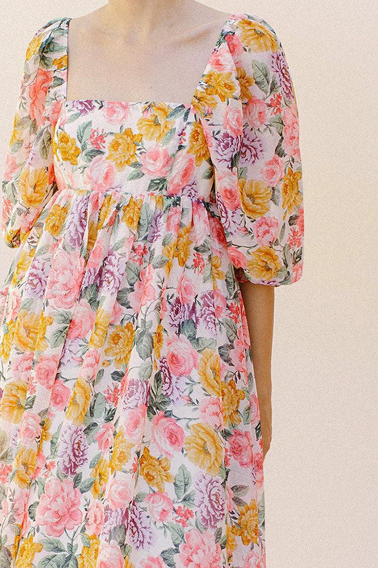 This striking Remi Floral Maxi Dress is both comfortable and stylish. Featuring vibrant multicolor roses and a classic baby doll silhouette, it includes all the details - a front and back square neckline, two chest darts, puffy 3/4 length sleeves, and a gathered maxi bottom with an invisible back zipper for easy access.