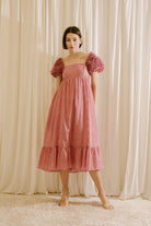Achieve an elegant and timeless look with the Mauve Rosette Midi dress. This romantic design features a square neckline, puffy sleeves, and darts for a perfect fit. An empire waist and smocked upper back ensure a flattering silhouette and an invisible zipper. The dress exudes feminine charm, allowing you to feel confident and radiant on any occasion.