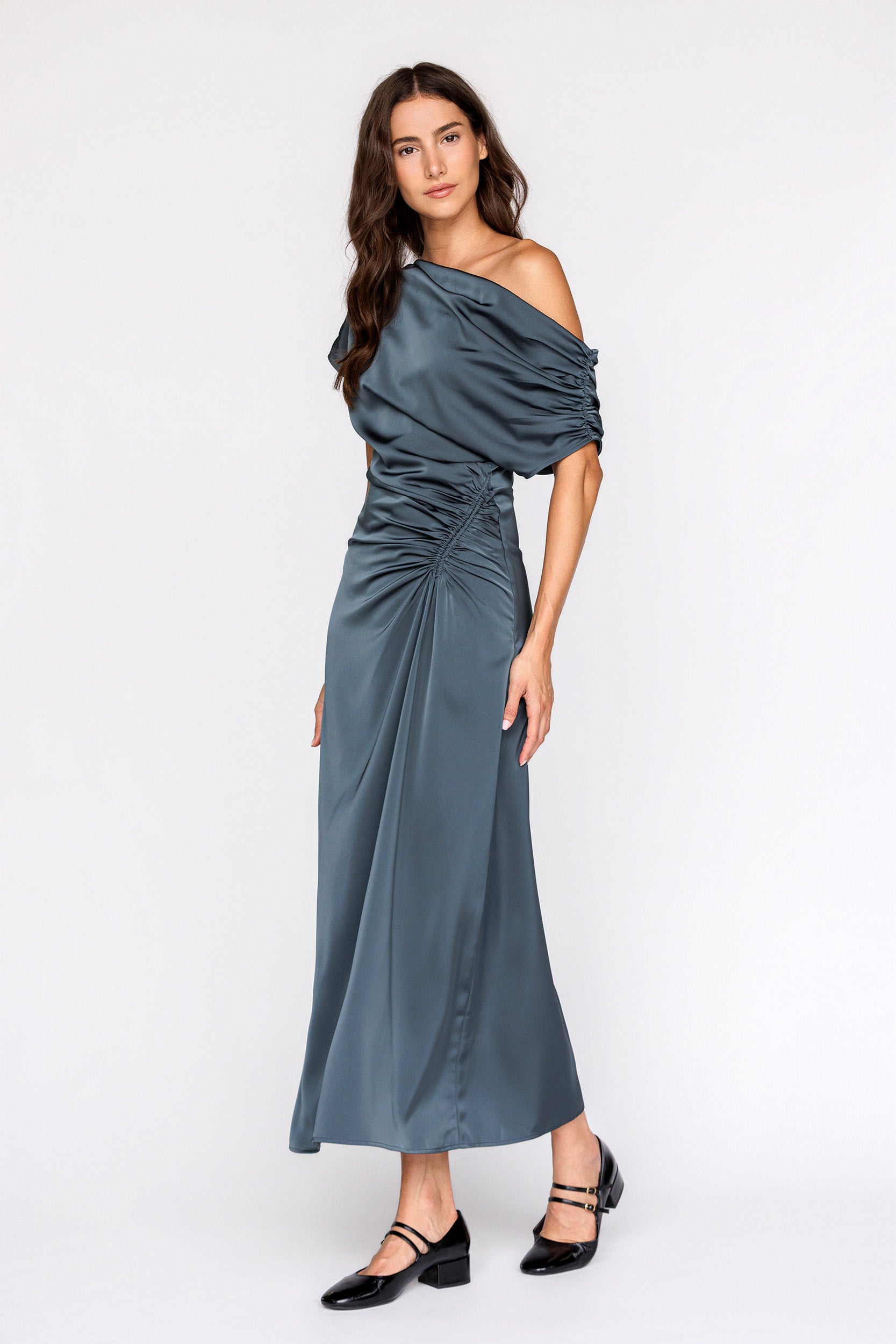 Meet the gown that makes effortless elegance feel easy. The Lyrah One-Shoulder Dress drapes beautifully with a soft, slouchy neckline and a modern asymmetric sleeve.