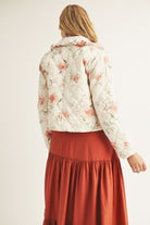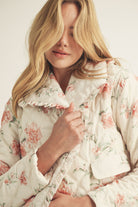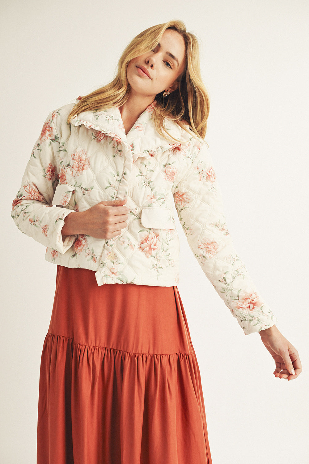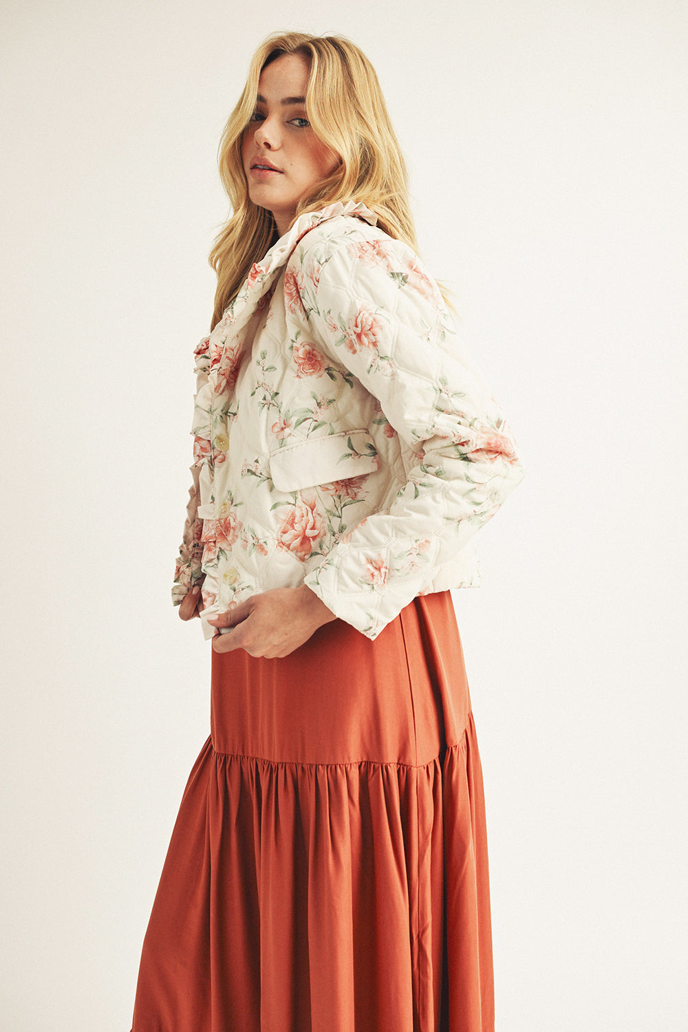 Meet the puffer that makes winter feel romantic. This floral-quilted jacket features a soft ivory base covered in watercolor roses, finished with delicate ruffle trim along the collar for a sweet, feminine touch.