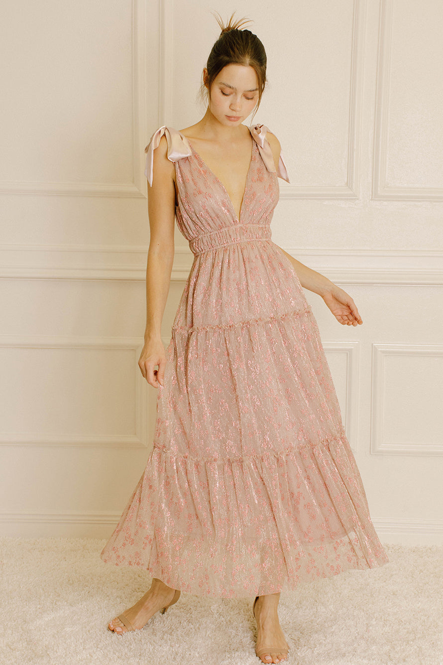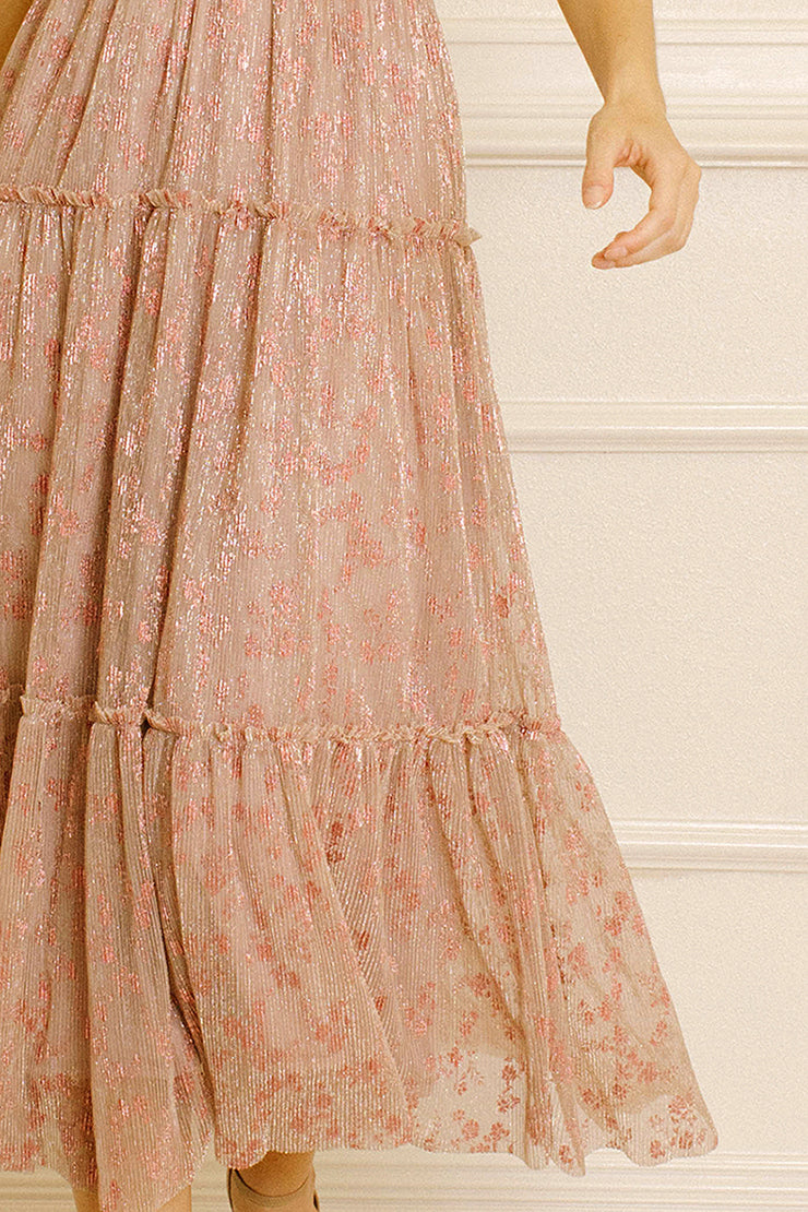 This gorgeously glam gown with its metallic-flowered skirt ruffles is a timeless must-have for any elegant soiree, with its deep V-neck, cinched empire waist, capped fluttery sleeves, and tiered ruffle 'skirting' off the style.