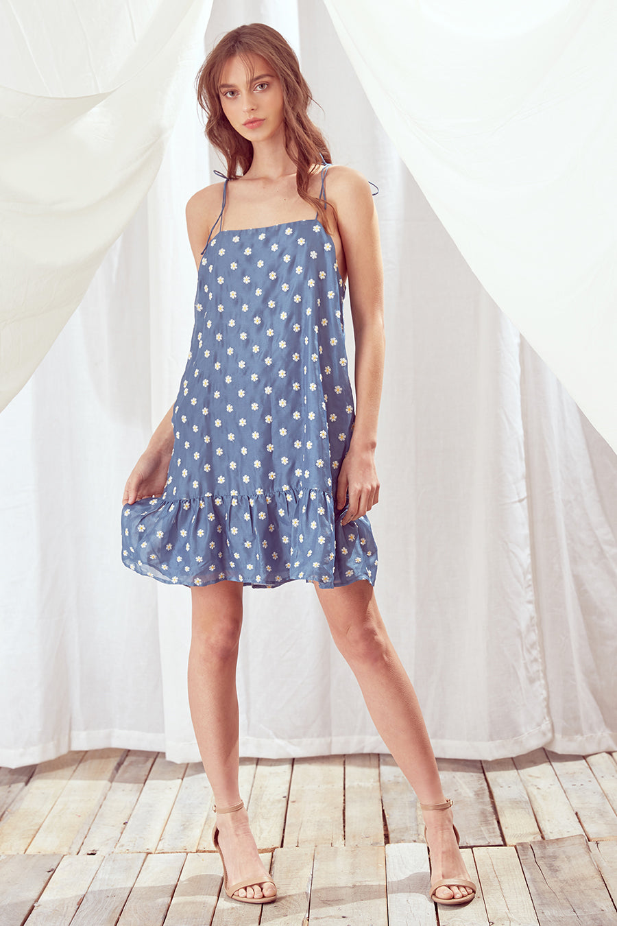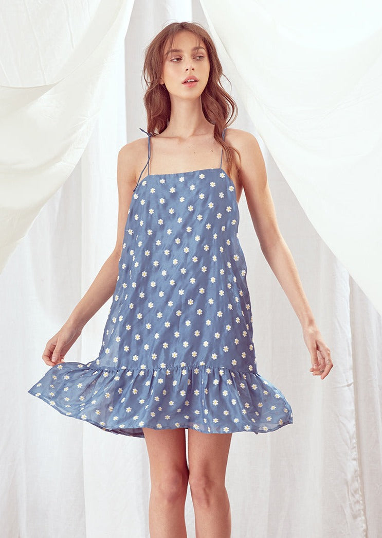 Stand out in this summer's parties and picnics with this adorable mini dress. Featuring a white and blue embroidered daisy print, picnic dress, a straight neckline, self-tie spaghetti straps, trapeze silhouette, and loose fit, this girly dress will be sure to make a statement.