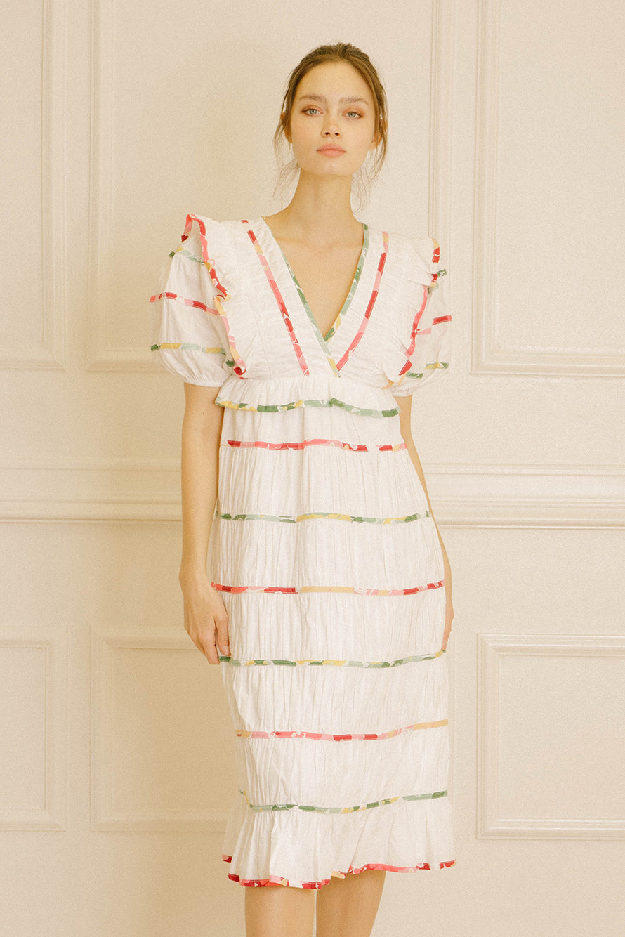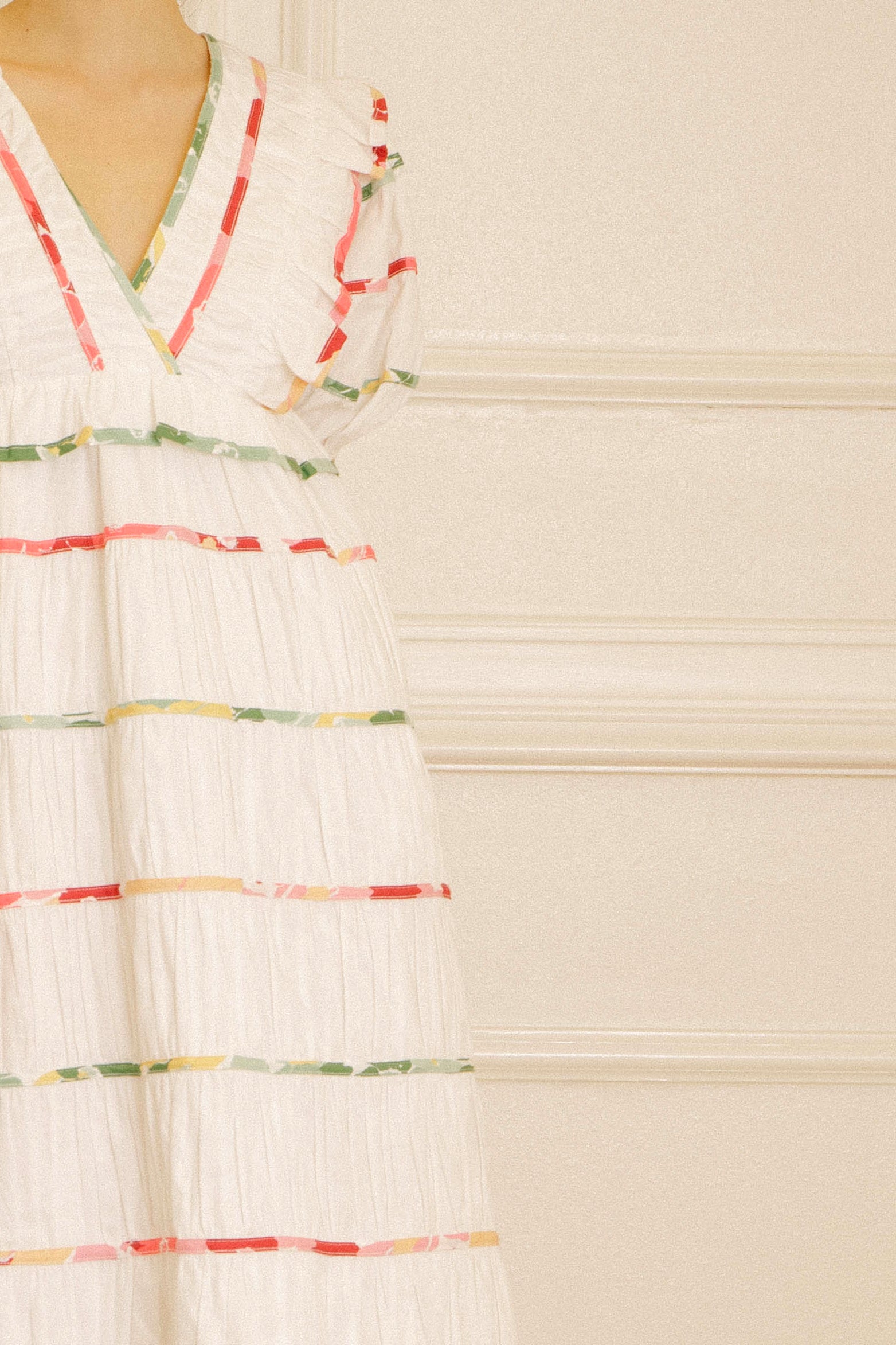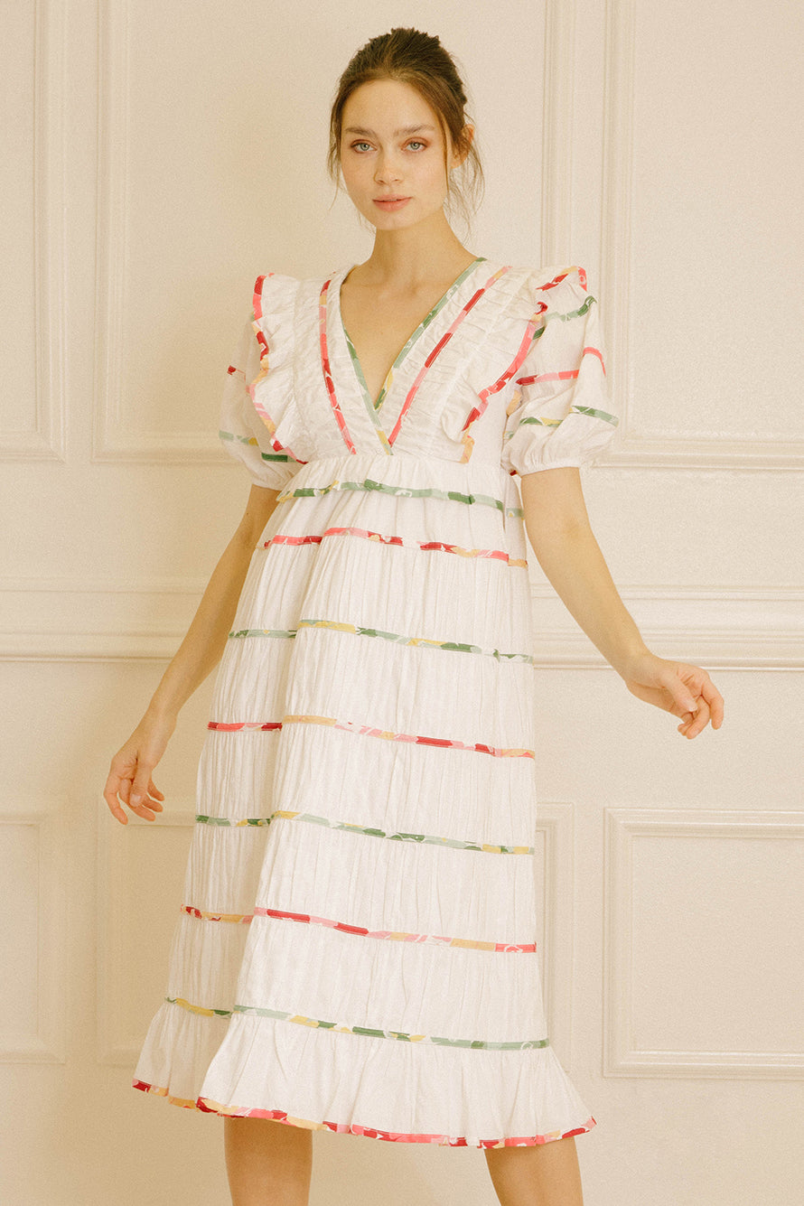 Stay fashionable and in style this season with this chic white tier dress. The vivid multi-color trim design adds a stylish touch, while the ruffled V-neckline, empire waist, and hem provide a relaxed and flattering fit. Perfect for a party or a vacation.