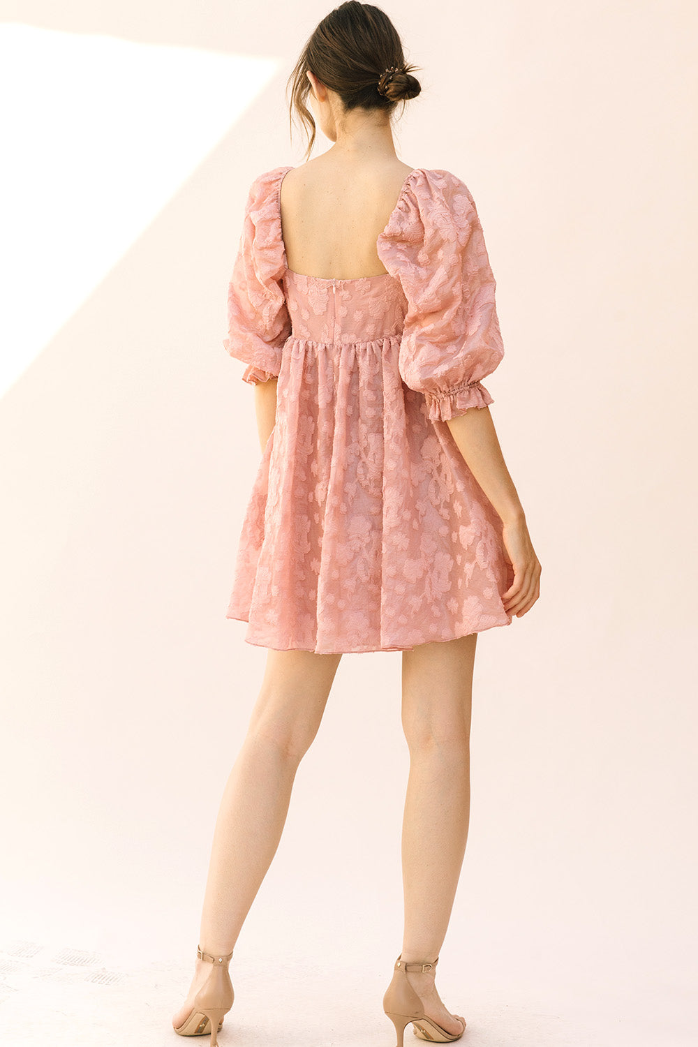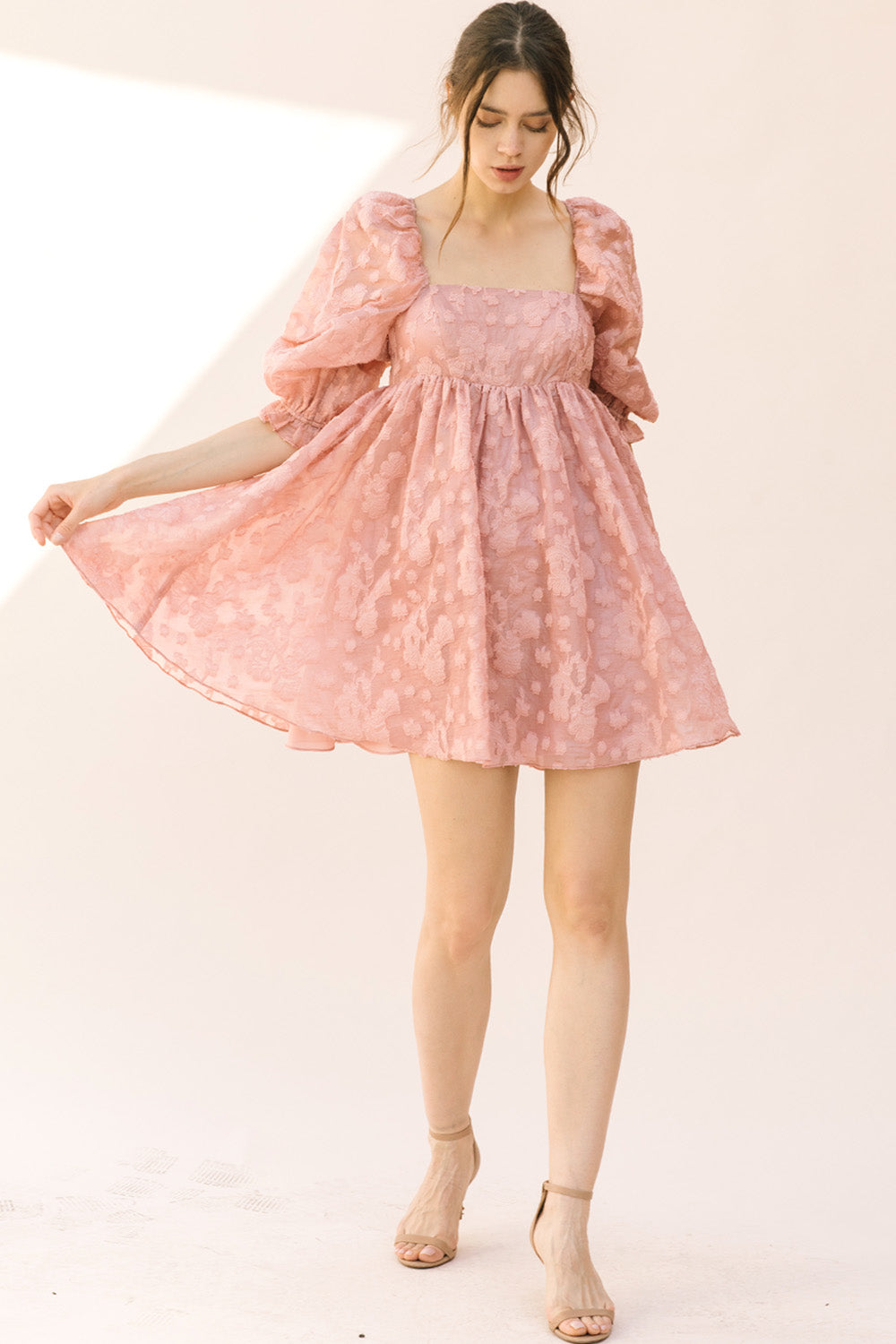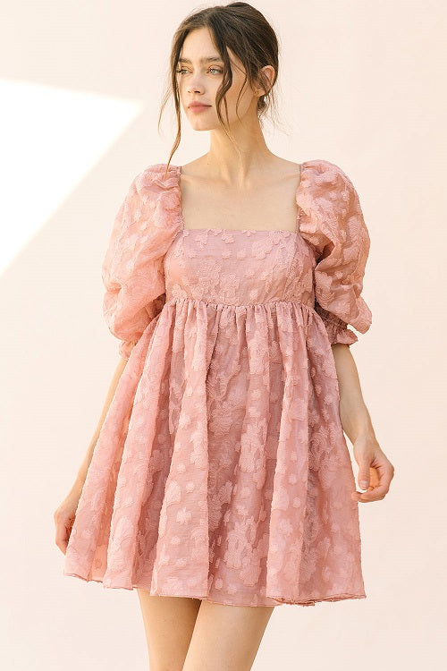 This elegant monochromatic embroidered floral baby doll mini dress with its revealing back/front square neckline and oversized 3/4 puffy sleeves with ruffled cuffs, as well as its gathering at the waist and A-line lower body creating a flattering silhouette, will make a statement at any event. It features an invisible back zipper for easy on/off access.
