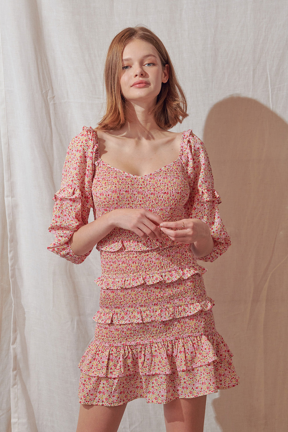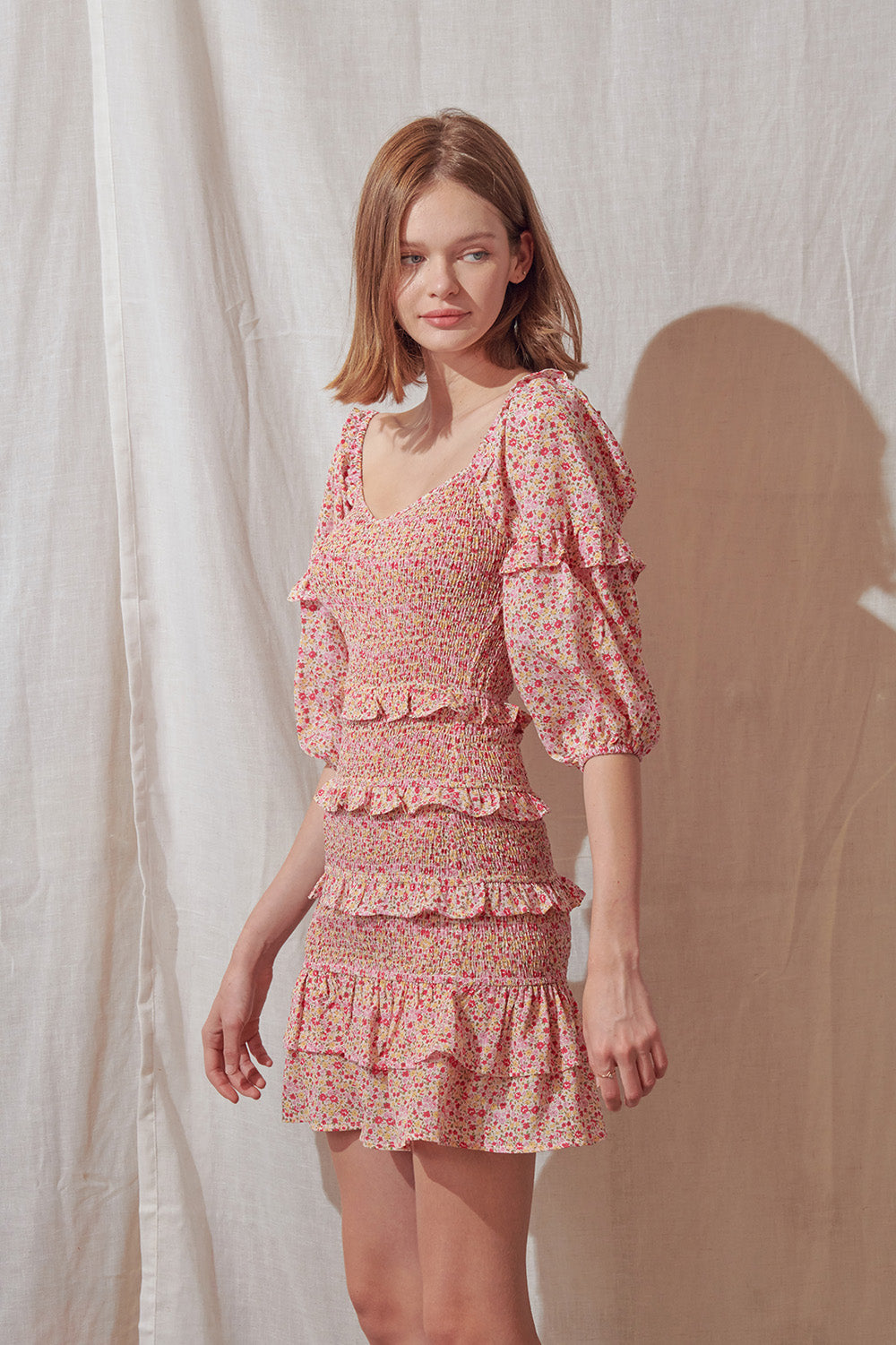 This Pink Floral Mini Dress is sure to make a statement. Boasting a square neckline and 3/4 bubble sleeves, this smocked dress is complete with a ruffled trim along the edges for added texture.