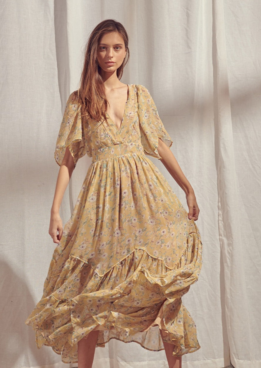 This Yellow Boho Style Floral Maxi Dress features a white and blue floral print, v-neckline with ruffled detail, cinched waist, and three tiered hem construction, making it an ideal choice for achieving a chic yet casual look. 100% Polyester.