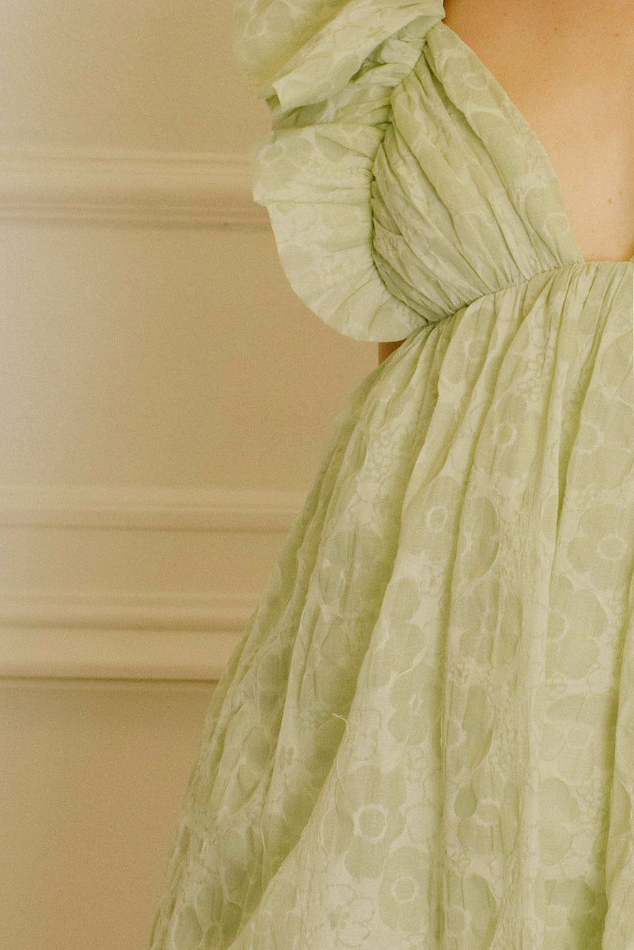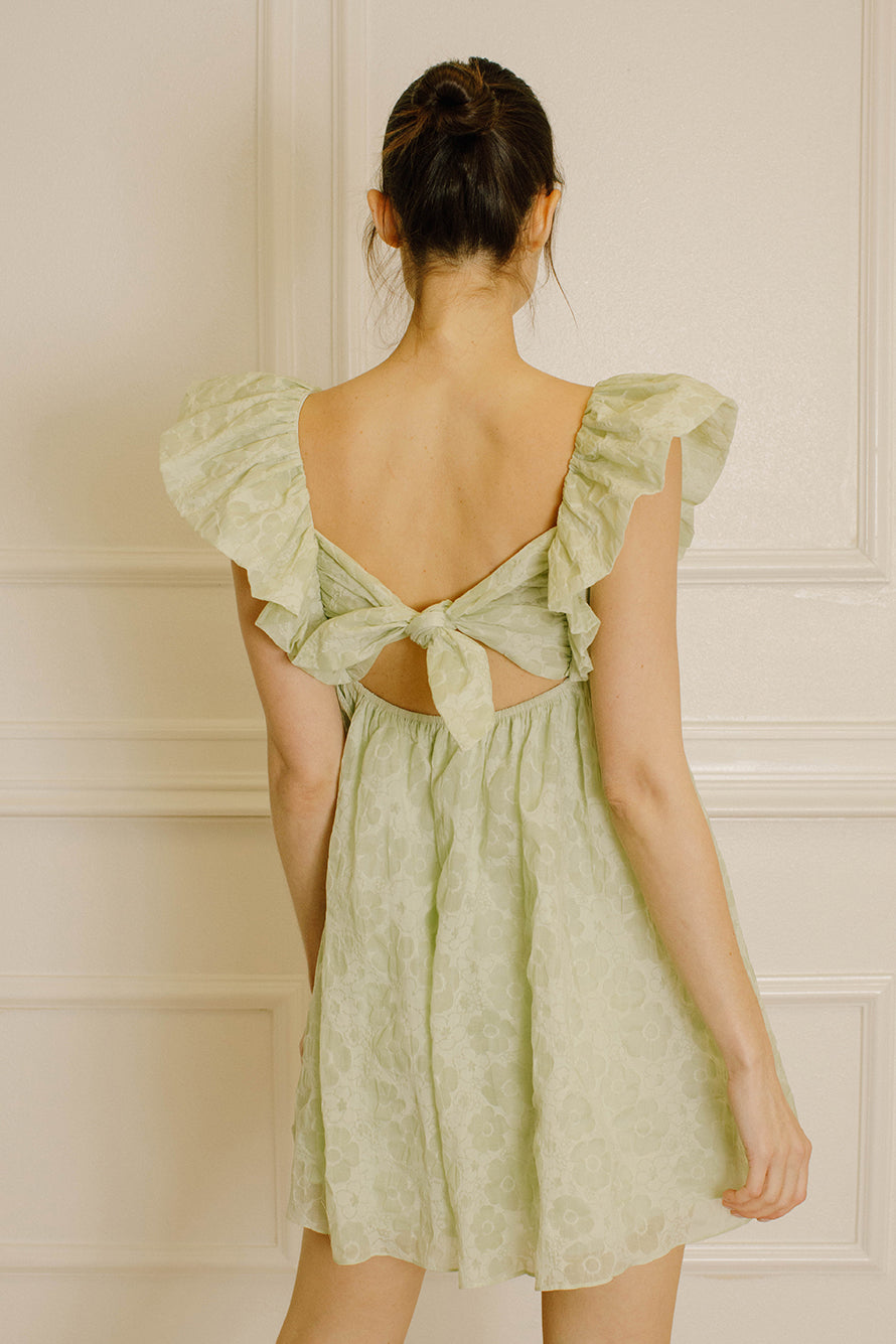 This Daisy baby doll mini dress features an eye-catching embossed print. A deep v-neckline, gathered bust detailing, and ruffled fluttered cap sleeves create a flattering silhouette. An under-bust gathering (empire waist) adds structure, while a bow detail across the open back provides an adorable finishing touch.