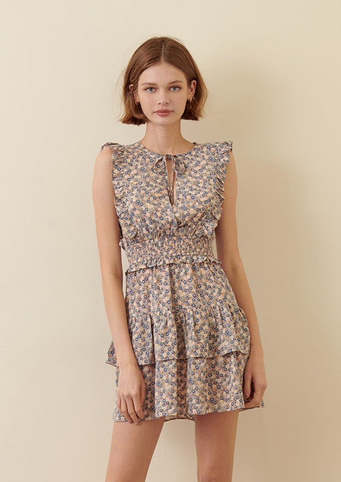 Rock this fitted floral smocked-waist dress on vacation. It's perfect for spring and summer with its layered ruffled bottom and front ruffle detail, and a thin ribbon for tie-front closure. Ideal for warm fall outfits, this dress will complete any smocked or dress ensemble.