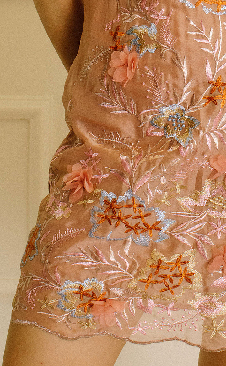 This Marie Mauve Mini Dress will make an elegant statement at any special event or date night. It features an intricately detailed, 3-D embroidered floral mini dress design, with a v-neckline, adjustable spaghetti straps, and a flattering fitted shift silhouette.