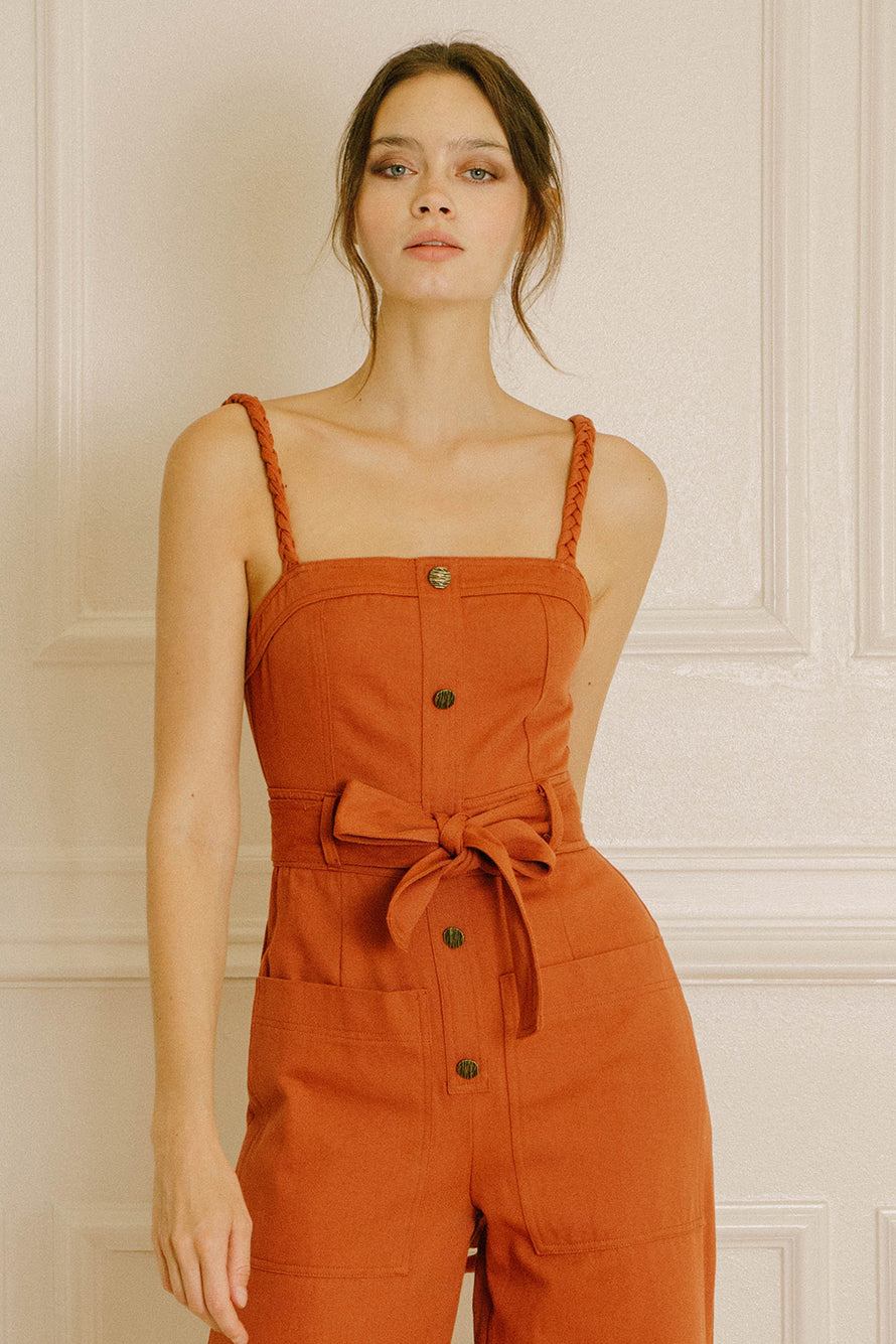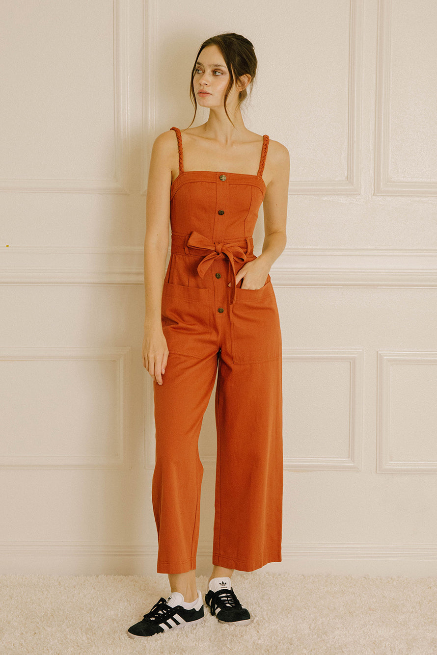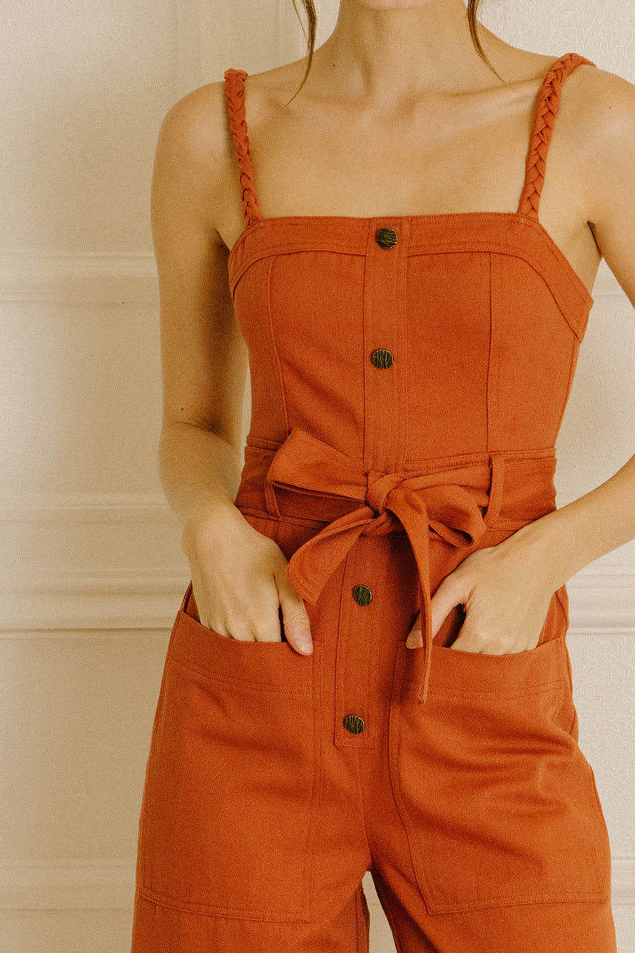 Achieve an effortlessly stylish look with the Ophelia Monochromatic Rust Jumpsuit. This jumpsuit is perfect for any summer or vacation occasion. It has a straight neckline, braided fixed thin straps, cinched belted waist, front decoration buttons, large front pockets, a back zipper, and wide ankle-length legs.
