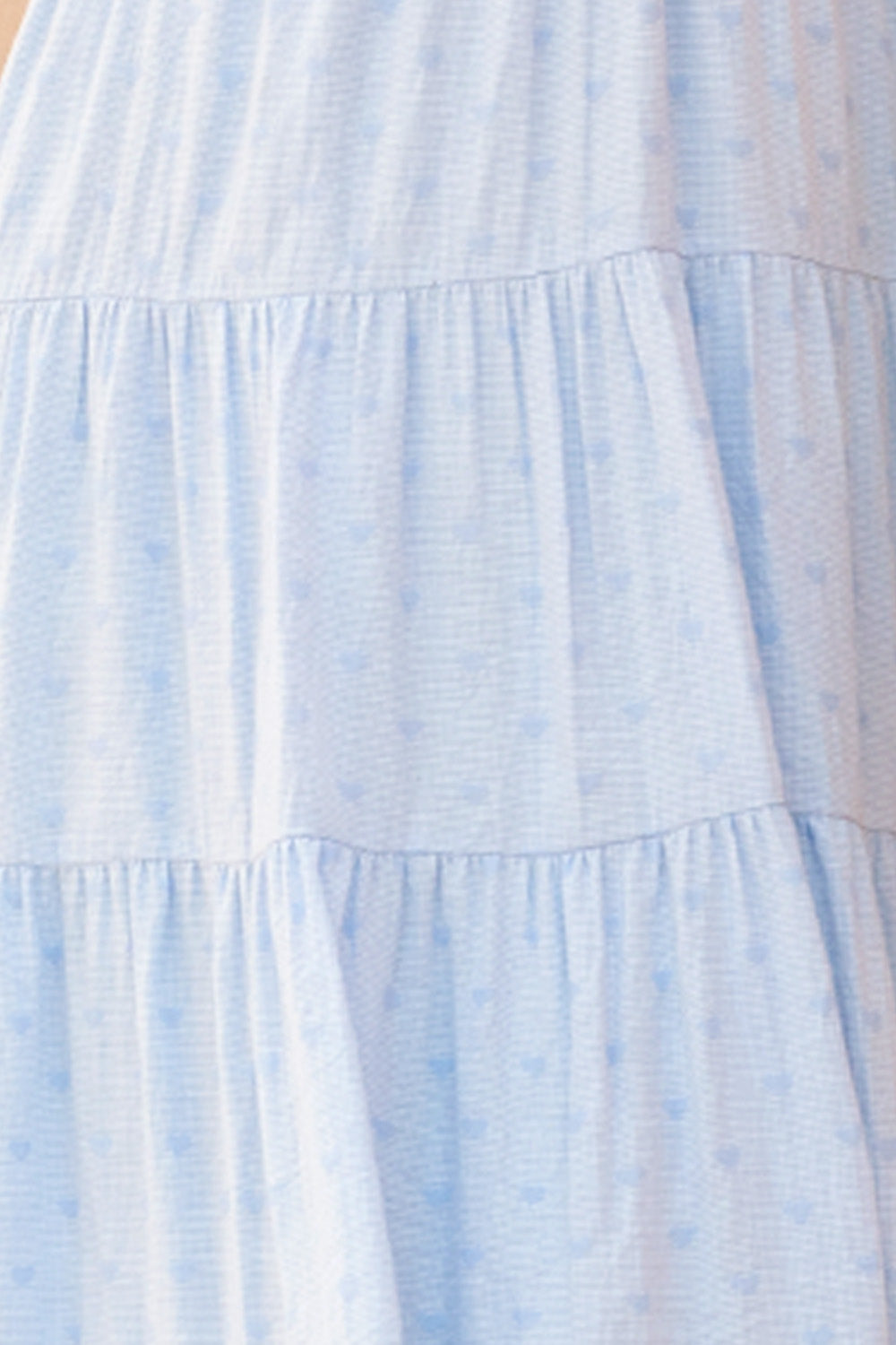 This Amara Blue Heart Print Dress is sure to steal hearts with its charming heart and gingham print. The straight neckline, ribbon self-tie straps, and empire waist create a flattering silhouette, while the ruffled flowy bottom adds a playful touch.