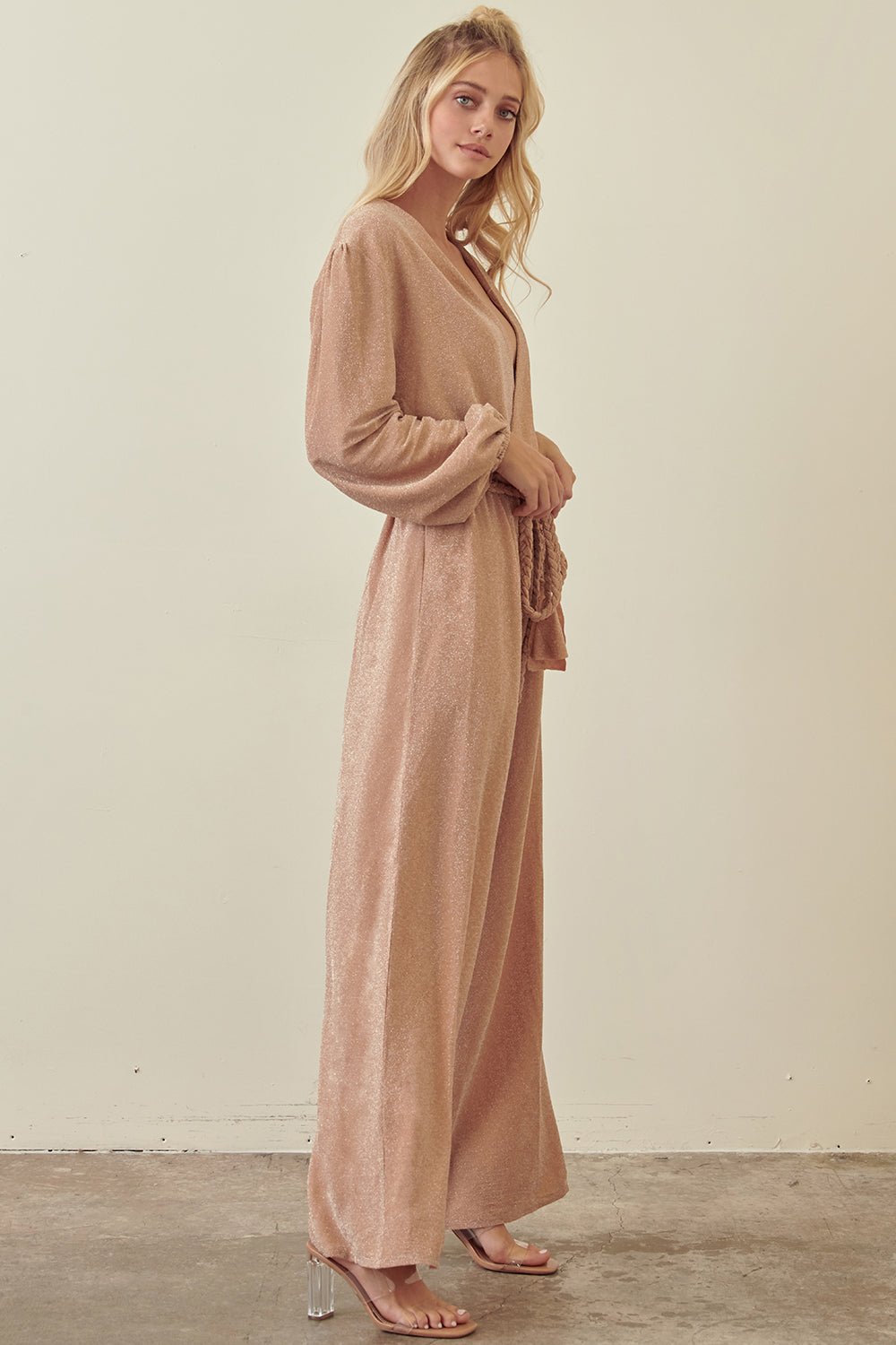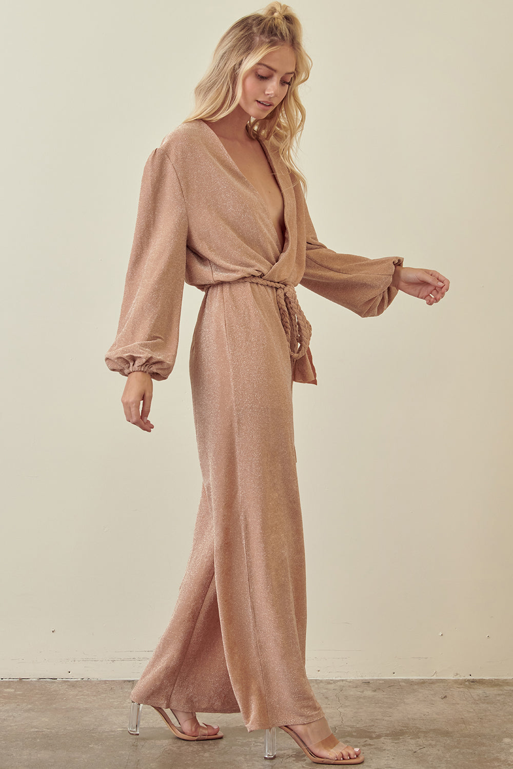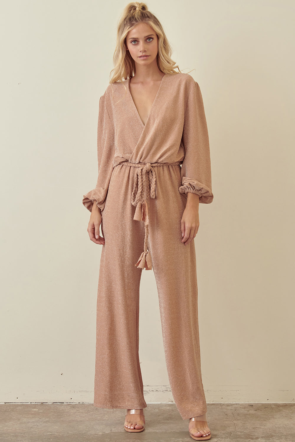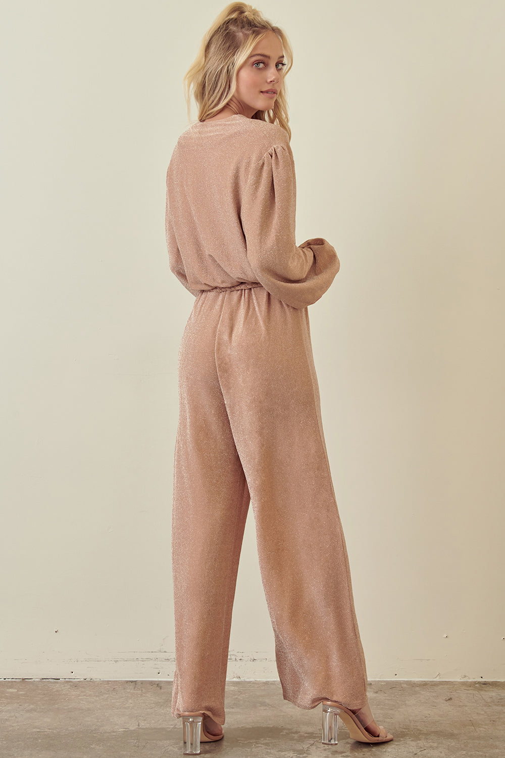 This apricot V-neck jumpsuit features shimmering sequins and long sleeves for a timelessly elegant look, perfect for any wedding event, date night, or casual chic gathering. Its sophisticated aesthetic makes it ideal for fashionable outfits.